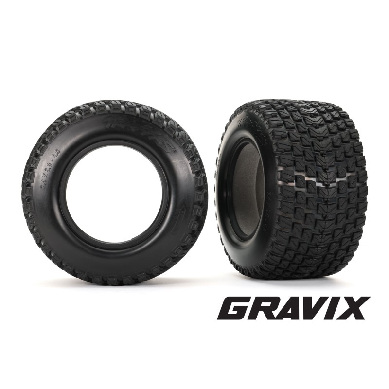 Low-profile 7.4″ x 4.0″ Gravix™ race tires are built to run hard at the track or in the wild. The directional tread pattern runs quieter than traditional off-road tires with excellent traction and a thick center carcass to prevent ballooning at high speed. Tires are sold as a left and right pair with foam inserts.